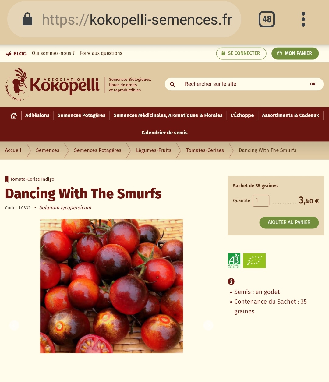 La tomate Dancing with Smurfs est interdite à la vente en Europe. Pourquoi ? Toutes les semences qui sont commercialisées en Europe doivent obligatoirement être inscrites dans le catalogue officiel européen des variétés. Ce catalogue est géré par le GNIS (Groupement National Interprofessionnel des Semences et plants), elle n’y figure pas. Il y a une raison que j’ignore, risque de transmission d’un virus, d’une maladie ?