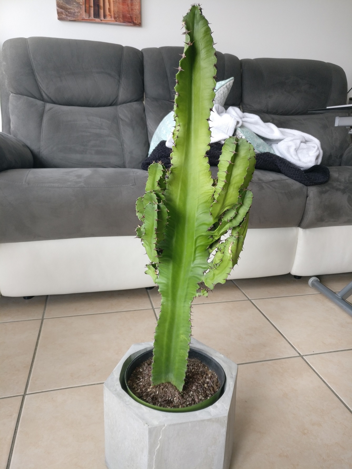 Aujourd'hui on voit que l'état de mon euphorbe s'est agravé. Le bas du "tronc" va toujours bien et est bien verte, le mal vient de mi-hauteur.