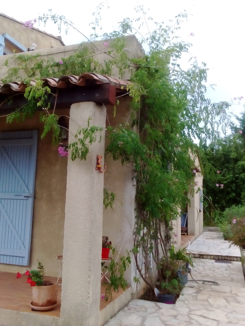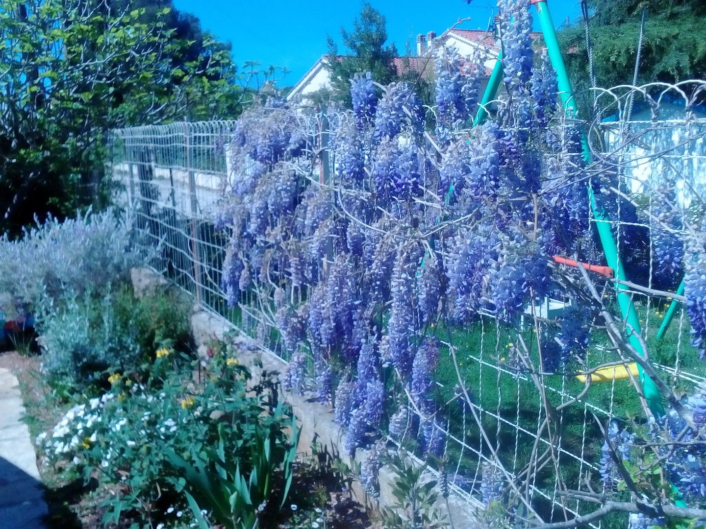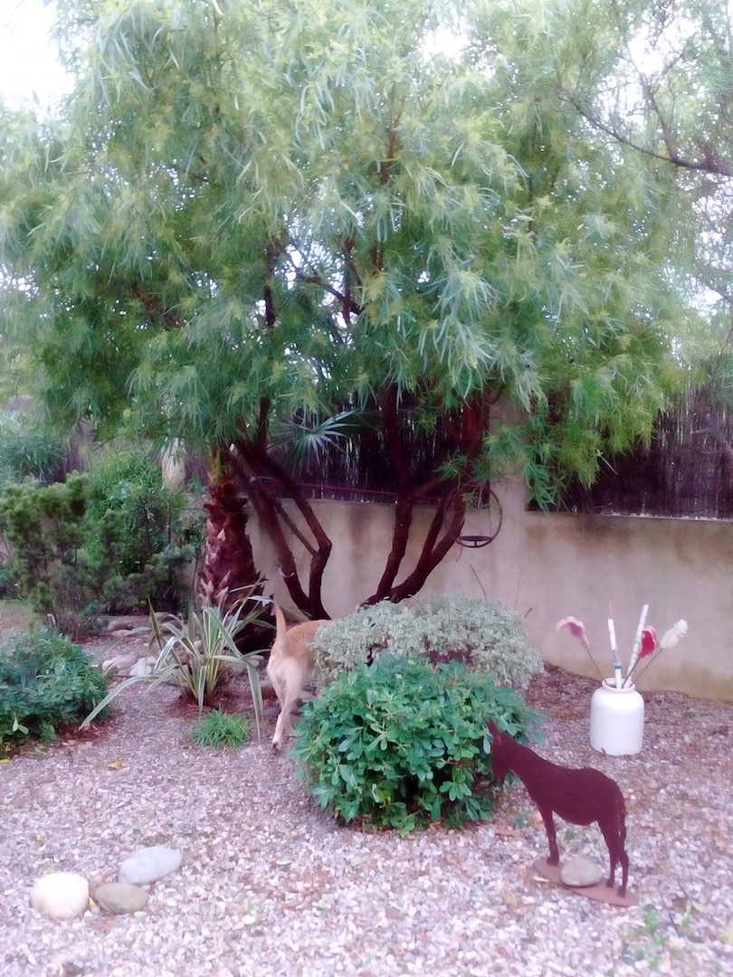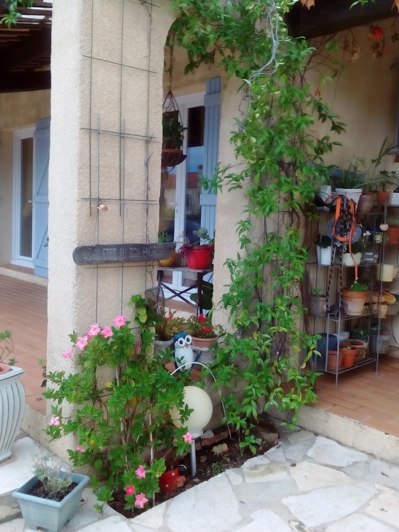 Enibas, Je m'excuse pour la réponse tardive. Le jardin est surtout consacré aux fleurs, à part un petit potager dont s'occupe mon mari, qui très souvent absent, fait du très simple car n'a pas le temps. Tomates surtout, salades.....Ma chienne, adoptée il y a 10 mois, est robuste et un peu brute, donc on fait en fonction...je joins quelques photos prises ce matin.....