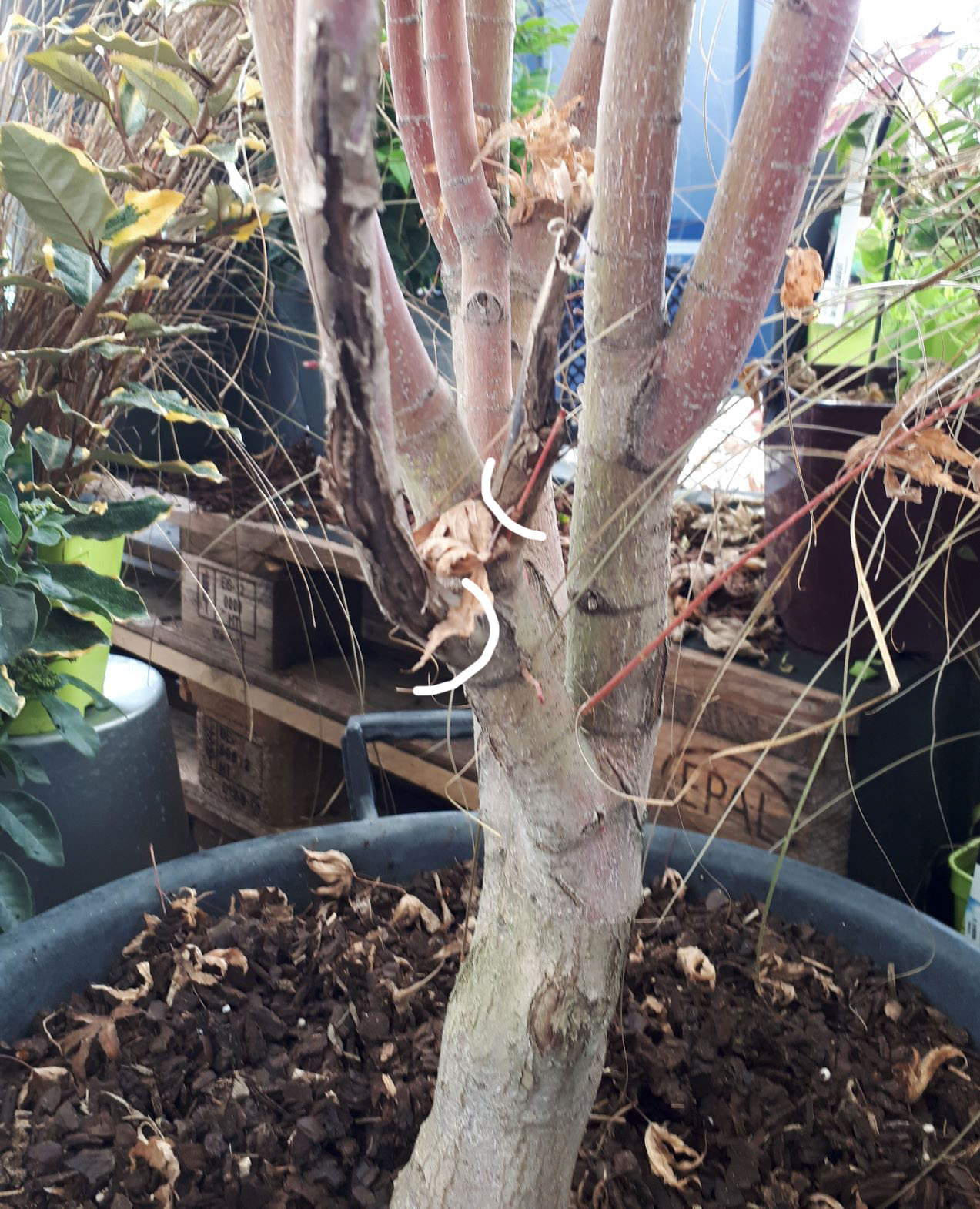 Deux cas de fentes longitudinales sur sango kaku rien que dans ce topic. Elles ressemblent à celles qui se produisent sur Abricotier et que l'on appelle chancres bactériens à pseudonomas. Ce symptôme me parle.