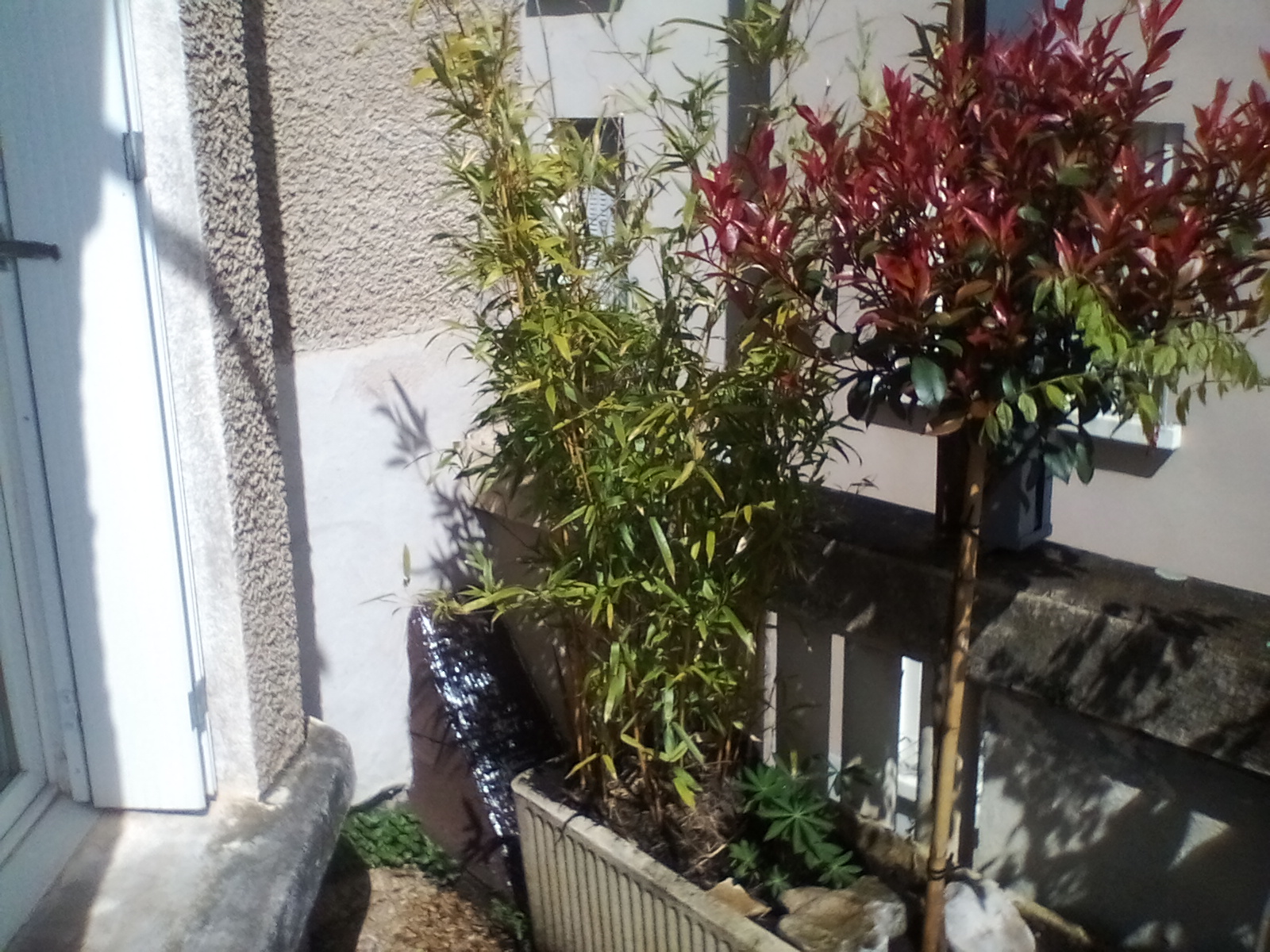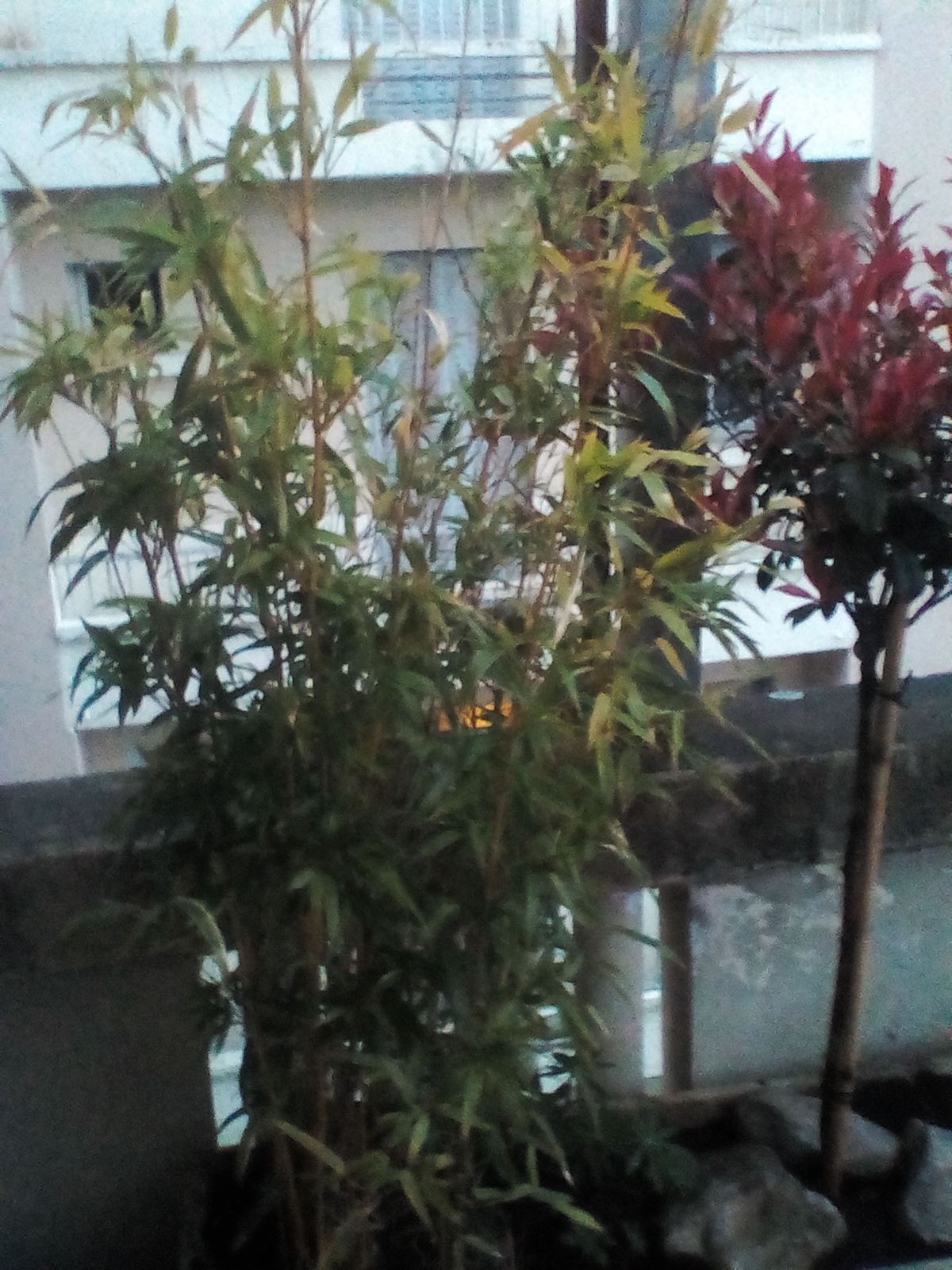 le pot est petit pour un bambou... si c'est un traçant il va tout remplir d'ici 2/3 ans et ton photinia va y passer, dans tous les cas les chaumes ne monteront pas très haut.