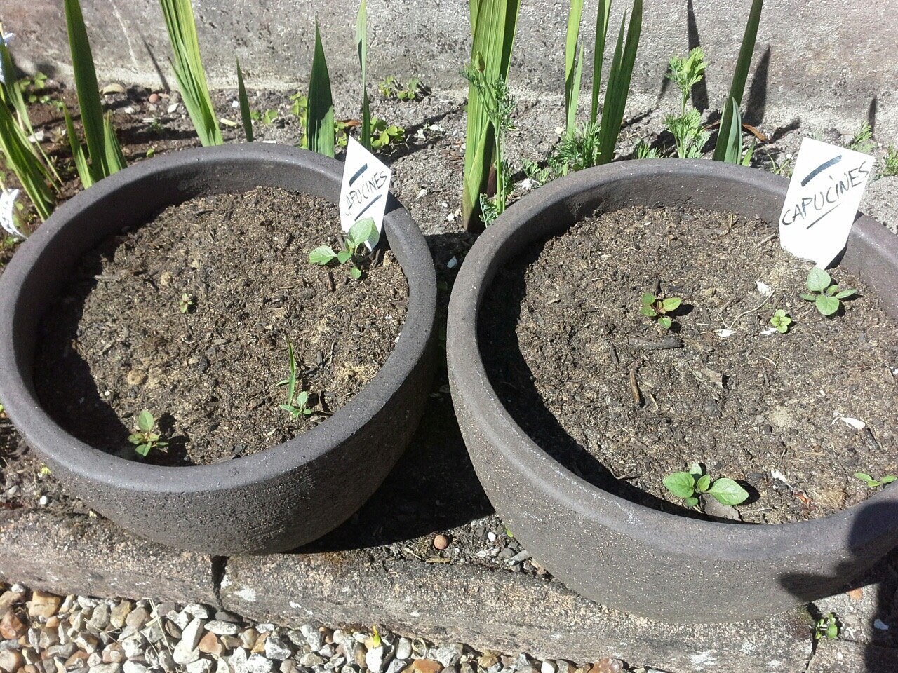 il y a un mois j'ai planté 5 à 7 graines de Capucine dans chacun de ces 2 pots.