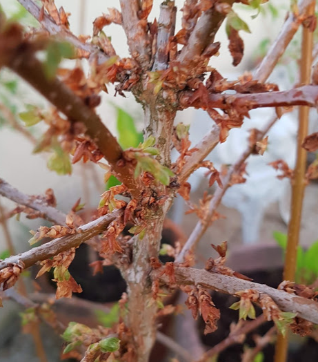 la plupart des pousses sont brulées sauf les feuilles au bout des branches