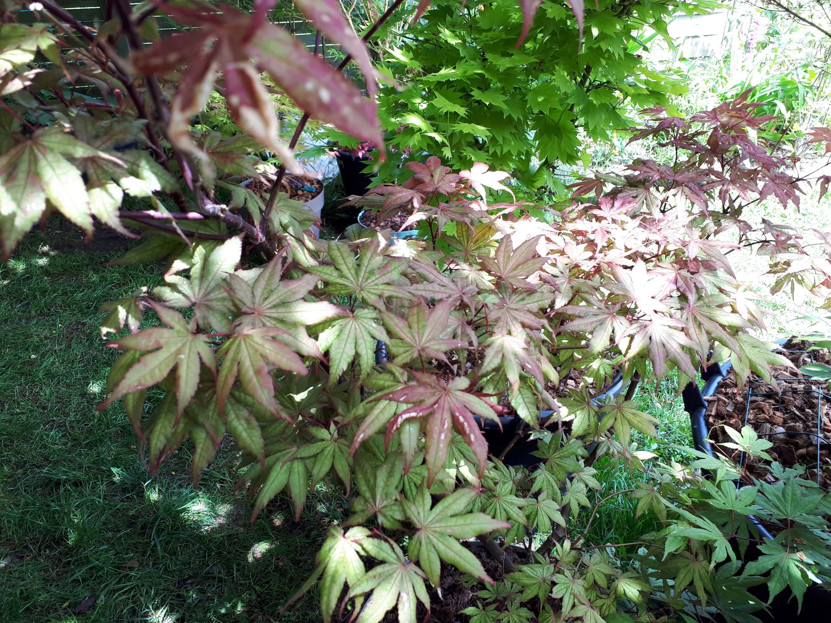 Une photo de groupe sous la pluie avec : 'amber ghost', 'sango kaku', 'bi-hoo', 'amagi shigure', 'Shirasawanum autumn moon' et, en arrière plan 'scholopendrifolium'.