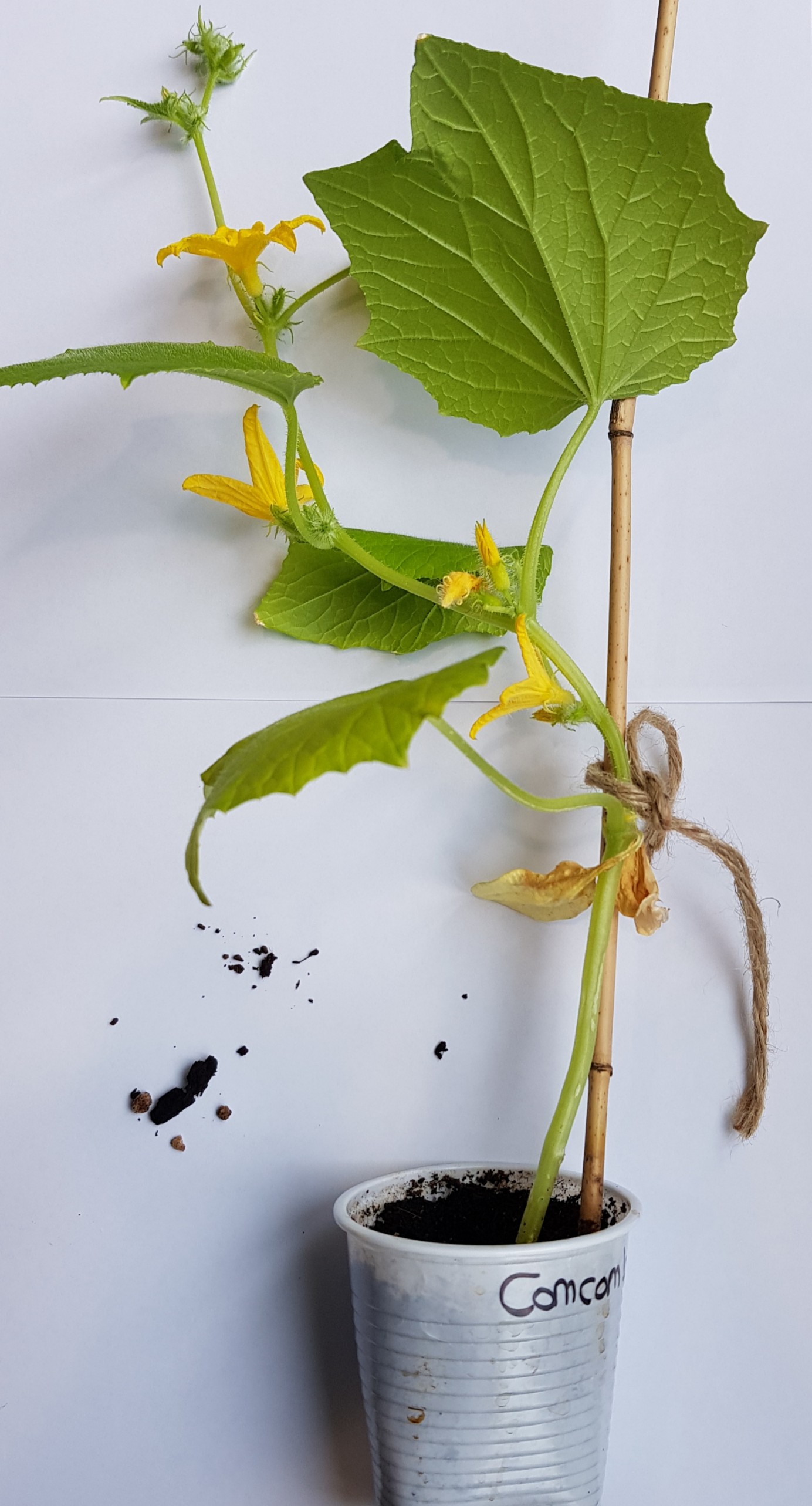 J'ai laissé le premier plant dans son pot de 9x9x9cm. Il a fait une pousse qui dépasse 1m et porte des fruits de 10 à 12cm, et des pousses secondaires qui ont aussi des fruits.