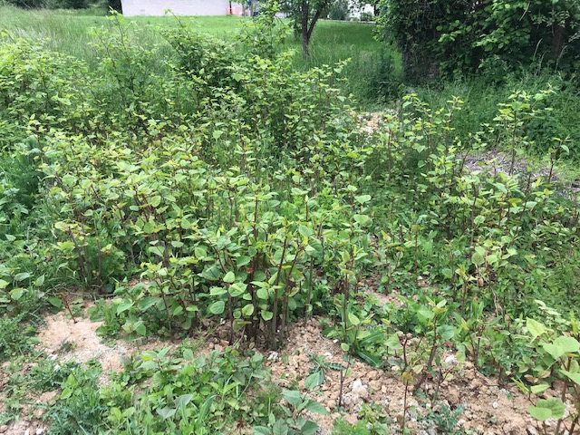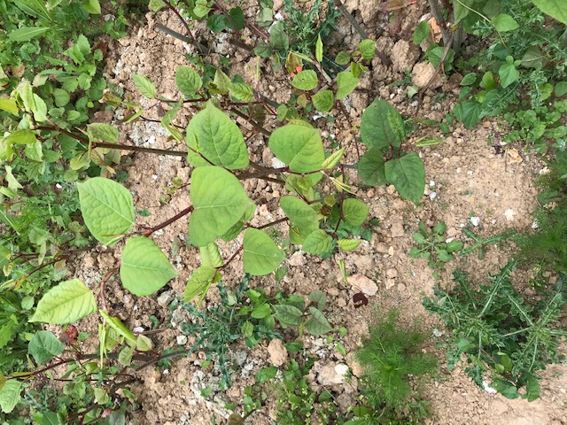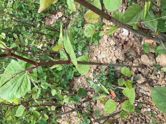 Il me semble que la grande plante installée un peu partout sur ton terrain est Fallopia japonica, la renouée du Japon. C'est une plante invasive dont il est difficile de se débarrasser.