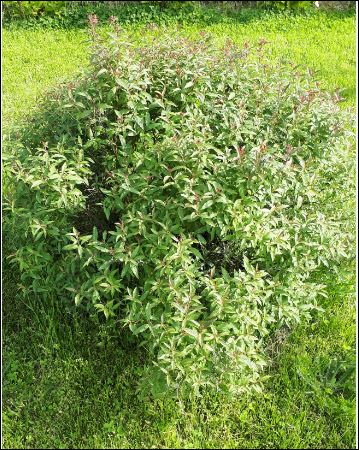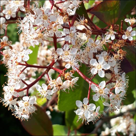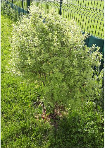 Arbuste planté le long d'une clôture d' 1m environ avec de petites fleurs blanches odorantes. A présent les fleurs ont séché et les feuilles sont devenues rouges.