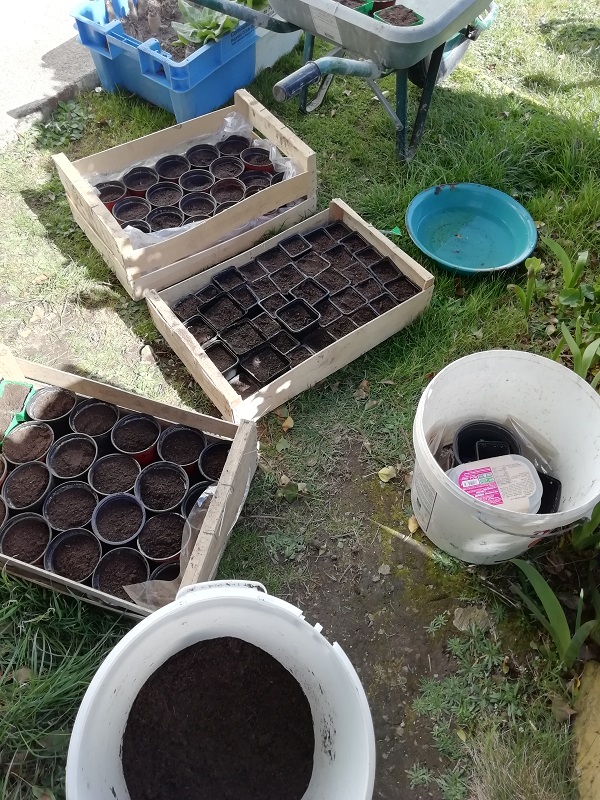 Toujours pris par le boulot et les travaux, mais quand même j'ai mis mes graines de tomates en scottex, préparé les godets, et semé direct en godet les cucurbitacées :
