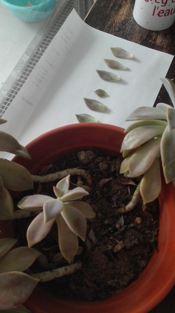 j'ai retrouvé quelques photos sur la première en bas à droite, il y a un godet plein de feuilles de graptopétalum qui on produit tige et racines