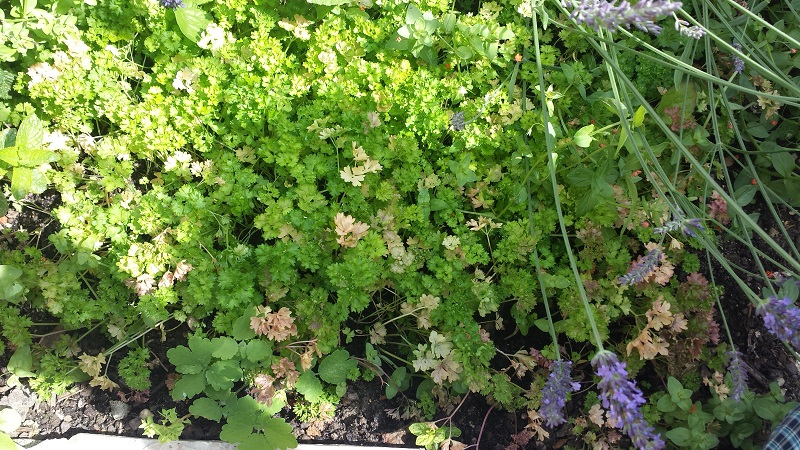 Depuis quelques jours, mon persil semé en tout début de printemps jaunie quelque peu sur les contours. Il est très serré, je n'ai pas éclairci. Arrosage, amendement, éclaircissement ?
