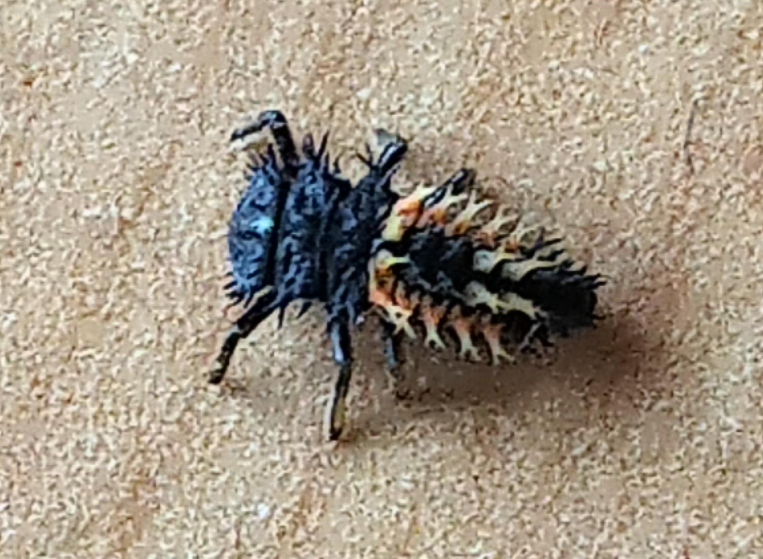 Elle mesure entre 5 et 10mm de long, elle a 6 pattes, un corps épineux dont l'avant est noir et la partie arrière est colorée: voir photo. Enfin, elle se déplace rapidement.