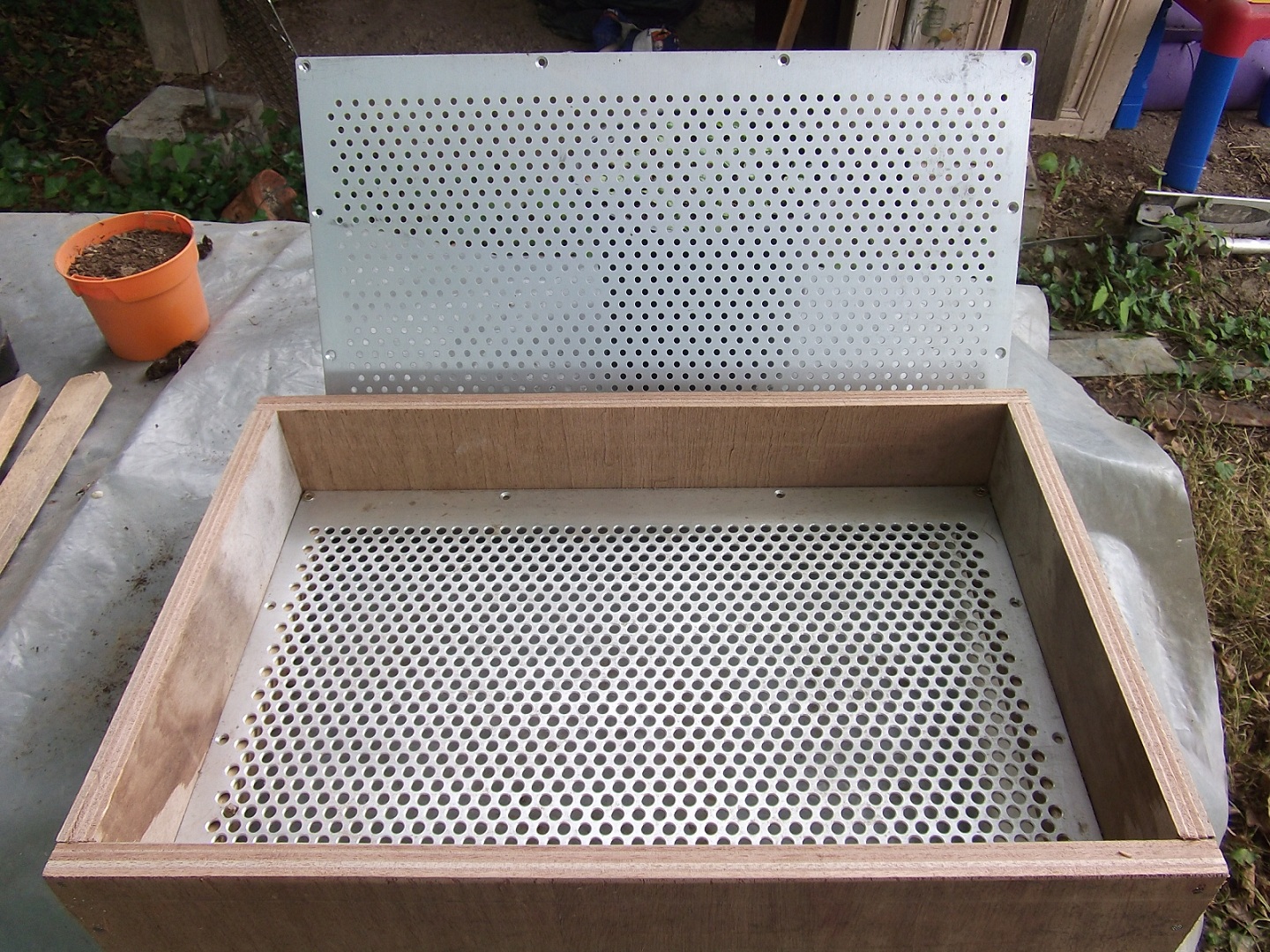 Les salades dans le fumier de cheval ne poussent pas plus vite que les autres à mon avis. Les plants de tomates grandissent et sont en fleurs mais pas encore de fruits formés. Le fumier de cheval est bénéfique pour les courgettes longues et d'Italie. J'ai commencé le repiquage des laitues Kinemontepas. Je me suis fait un nouveau tamis avec une grille d'aération de machine. Les trous (620 trous) ont été repercés et ébavurés à la fraise. Un cadre en bois et le tour est joué. La "mouture" est parfaite pour le repiquage en godets.