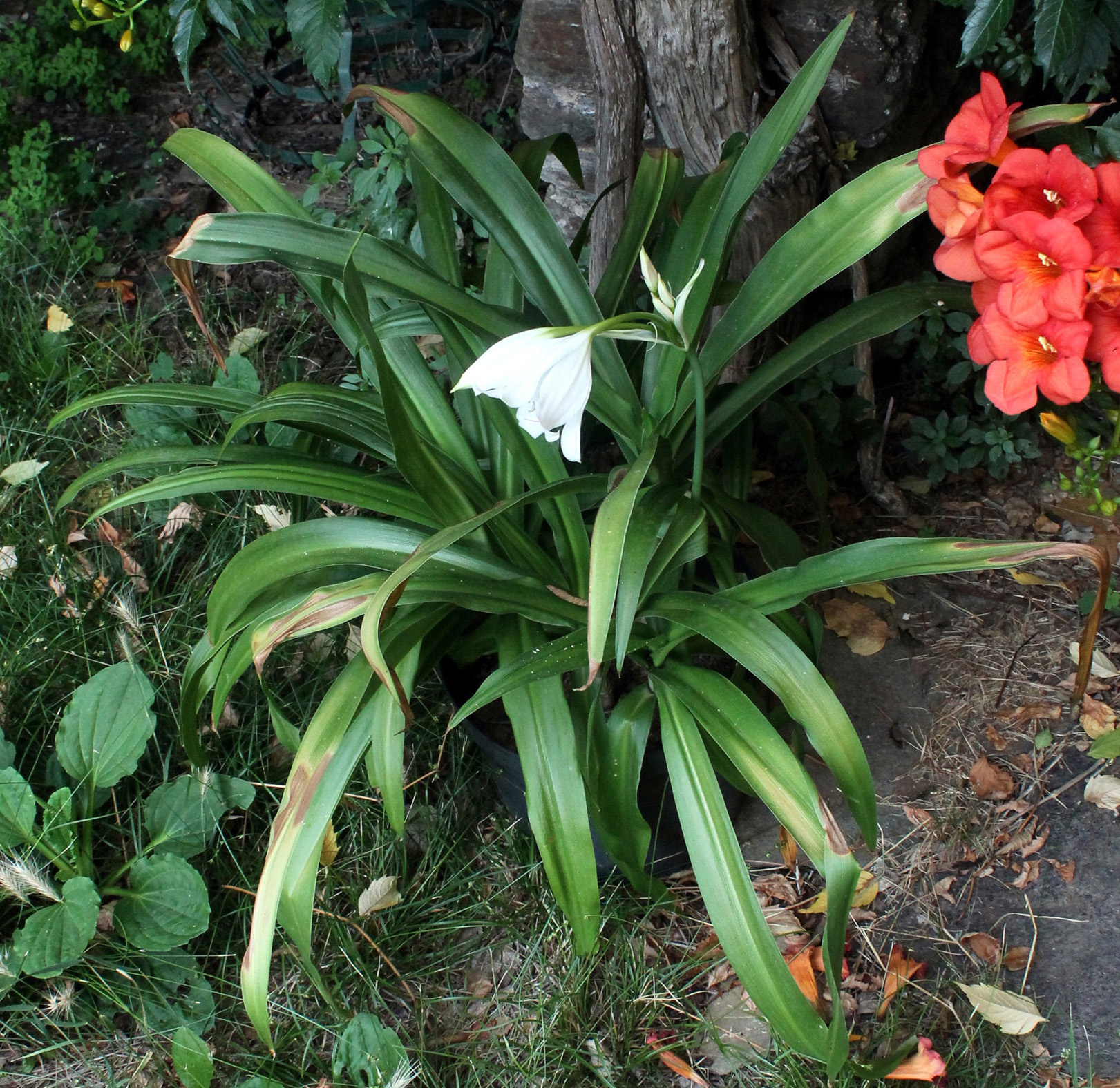 Avec retard sur ceux dont les bulbes ont été mis en pot, les crinums de pleine terre sont passés à fleur.