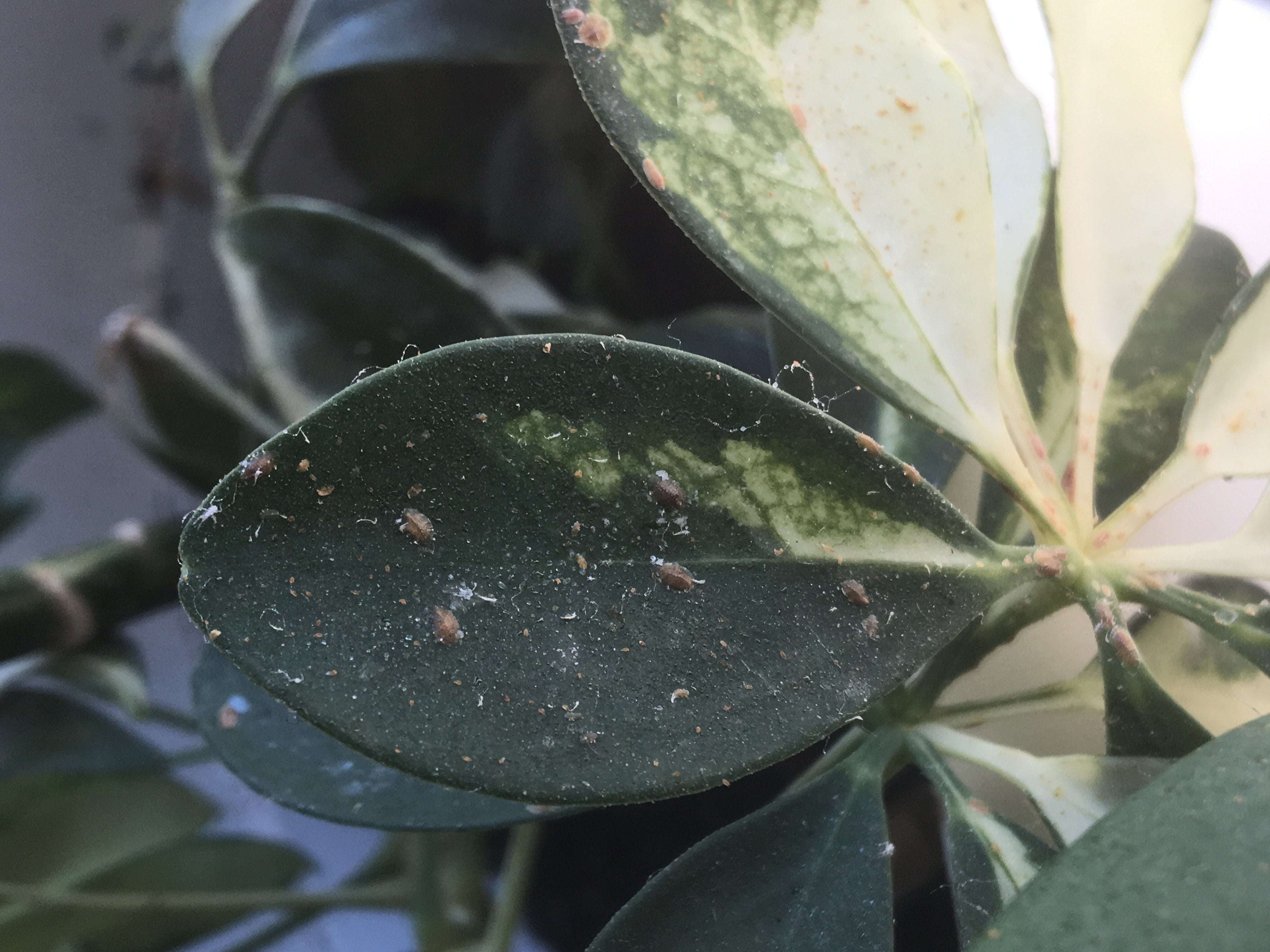 La plante est un Schefflera et les parasites marron des cochenilles à carapace.