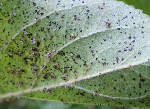 Mon pommier présente de nombreuses petites tâches noires sous les feuilles avec des petits insectes jaune et noir (voir la photo). Le dessus des feuilles a blanchit. Je n'arrive pas à identifier les insectes en question. Auriez-vous une idée et comment je peux les supprimer ?
