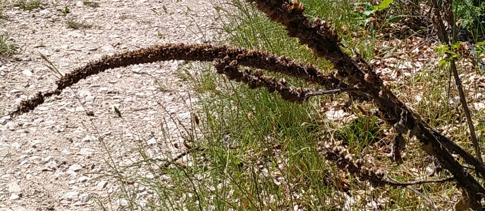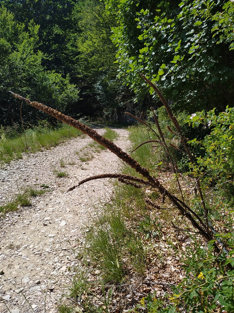 j'ai croisé ces longues tiges couvertes de fleurs en graines, semblait-il (environ 120 à 150 cm de long) sur le large chemin des muletiers en plein synclinal perché de Saoû (Drôme), à environ 550 ou 600m d'altitude.