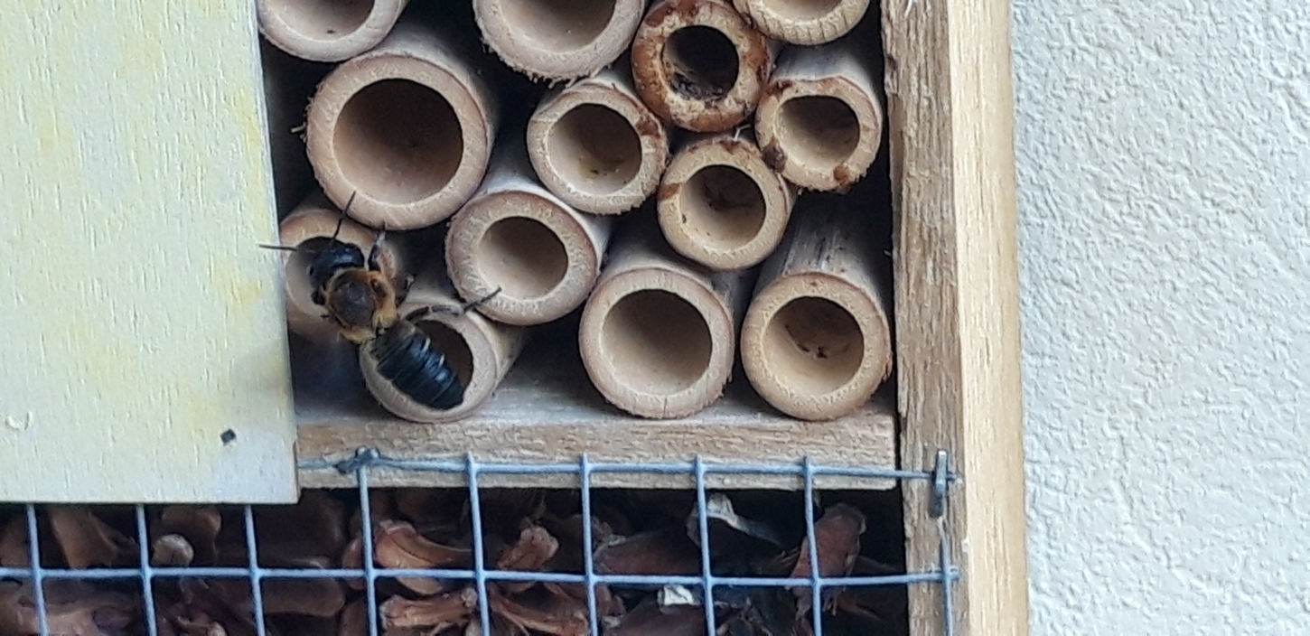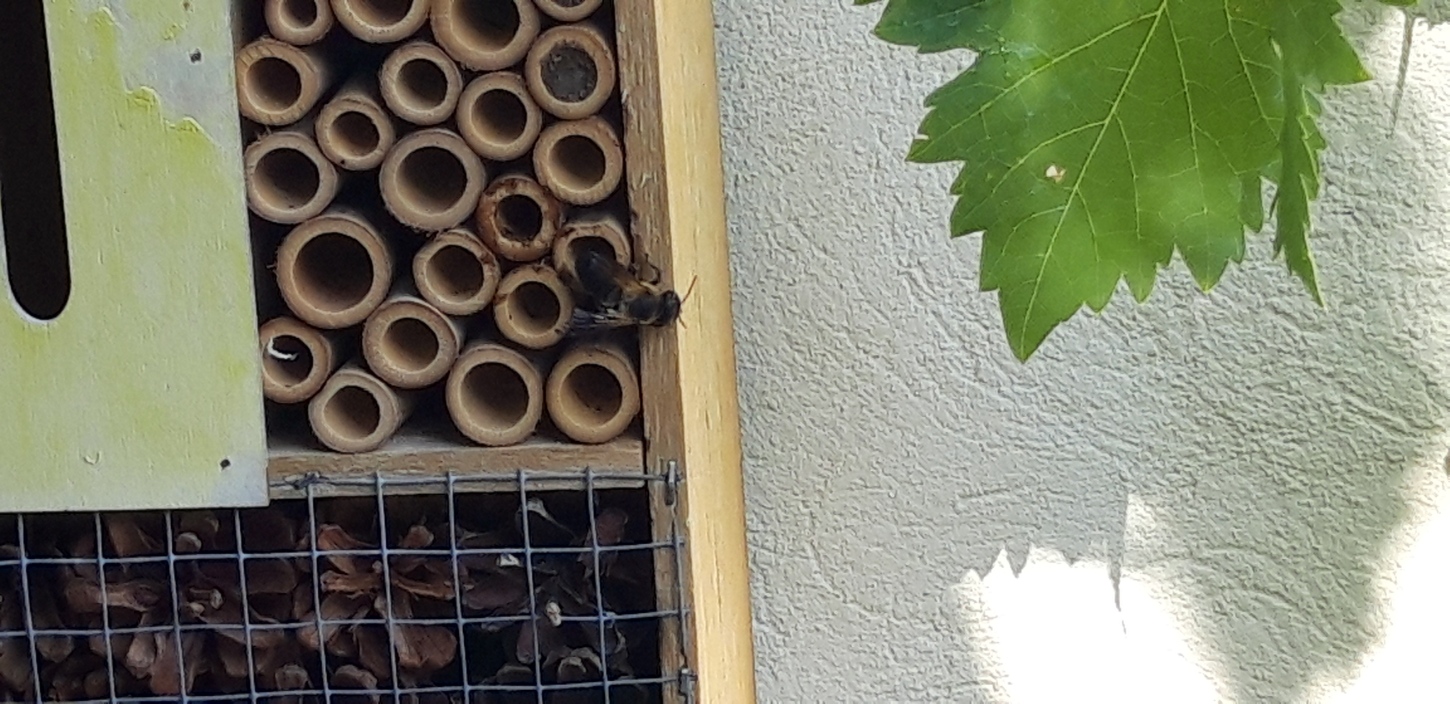 En rentrant de vacances ce matin, j'ai eu la bonne surprise de voir que mon hôtel à insectes était occupé 😊.