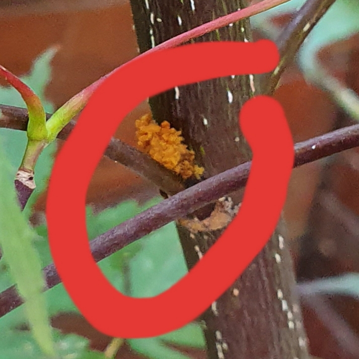 Ce matin, j'ai remarqué des amas oranges sur la base de certaines branches?! Oeufs ou champignons, aucune idée...en pj, un cliché de ces squatteurs..