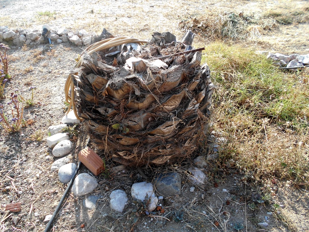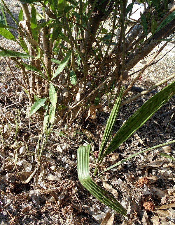Ce matin, je me décide à nettoyer ce coin de jardin, un peu maudit, que je délaisse d'habitude... Quelle n'est pas ma surprise : en arrachant quelques "mauvaises" herbes, je découvre deux petites plantes bien différentes... deux semis spontanés de mon palmier, j'avais laissé de nombreuses graines sur place ! Et finalement la nature se dévoile une fois de plus sous son plus beau jour, nettement plus forte que ce que l'on suppose, et m'offre un joli cadeau, la renaissance possible de mon palmier !!!