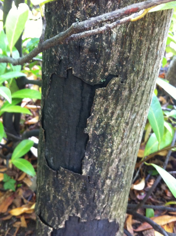 Dans la partie boisée au fond de mon jardin, il y a un jeune érable tout sec depuis déjà quelques mois. L'écorce est décollée et dessous c'est tout noir.