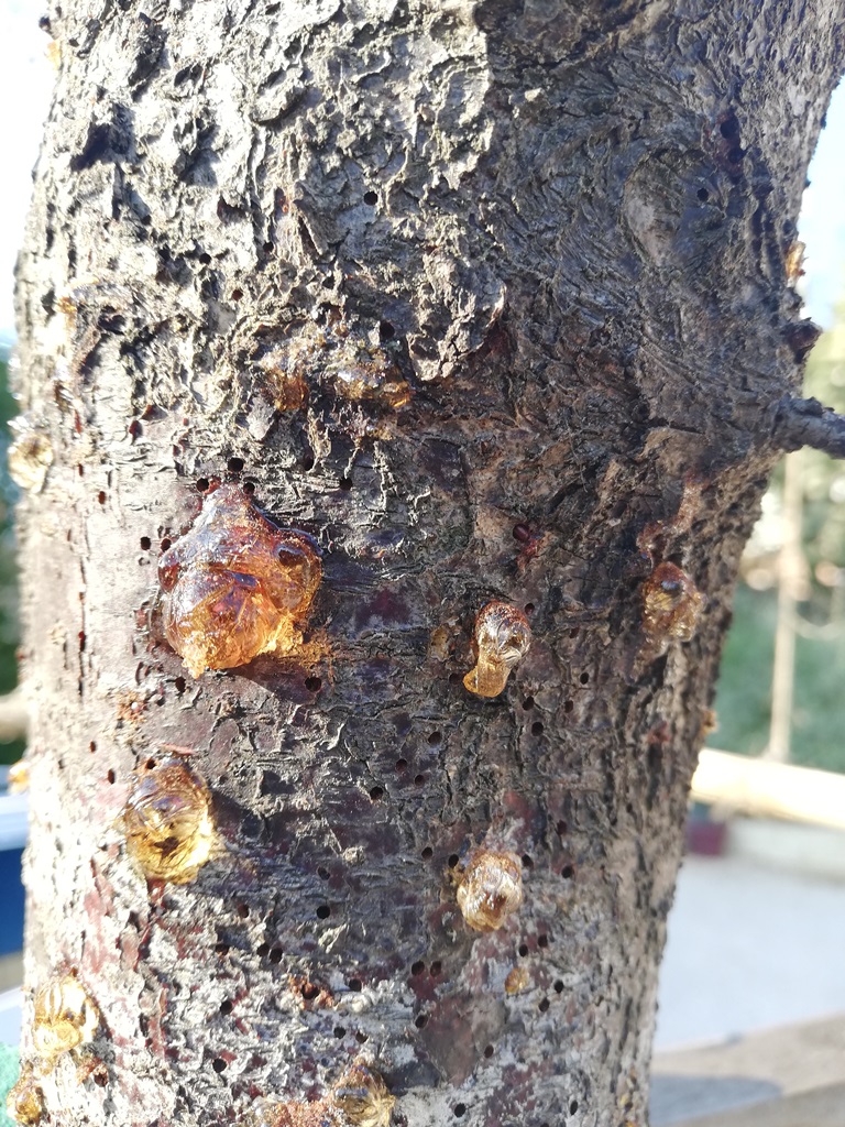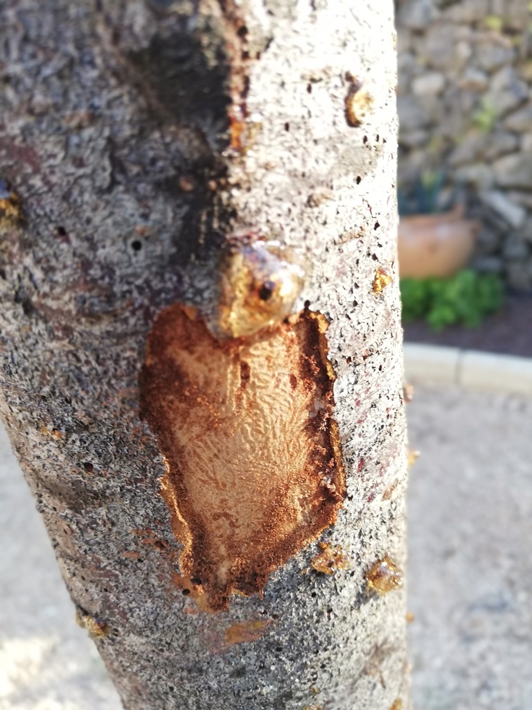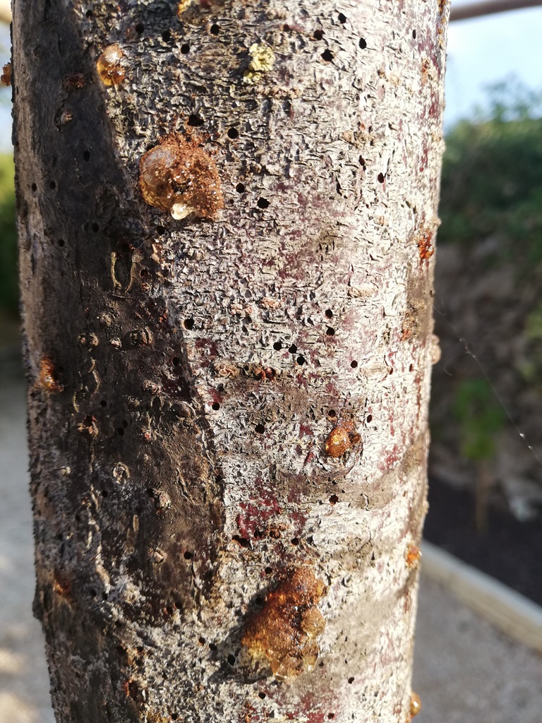 J'ai planté un prunus de pissardi en début d'année. Il a commencé par fleurir puis le mistral (j'habite Marseille) a enlevé la quasi totalité des fleurs. Courant Juillet j'ai observé que la sève coulait du tronc en grosses gouttes. Je n'y est pas prété attention... Voyant hier que les quelques feuilles renstantes sont bien faibles, j'ai regardé de plus près l'arbre et constaté bon nombre de petits trous; l'écorse de l'arbre s'enlève facilement à certains endrois...