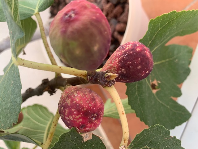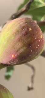Le figuier est en pot, ses feuilles ont un aspect normal. Tout au plus puis-je noter la présence de nombreuses fourmis sur son tronc. Et ces pustules sur toutes les figues qui y poussent...