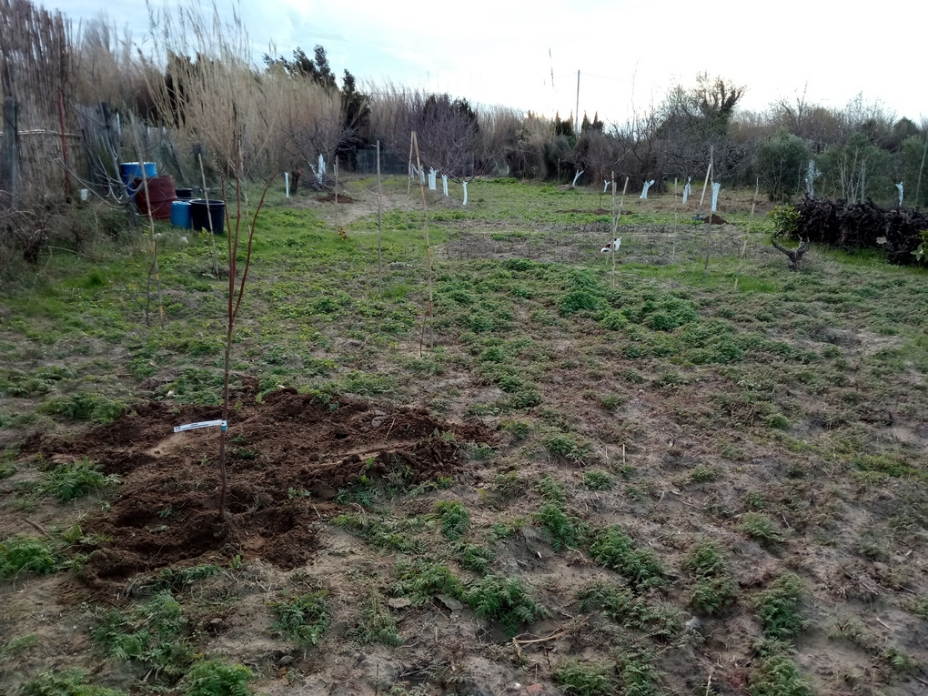 Une zone de vigne arrachée et semée en luzerne, et plantée en même temps en jeunes arbres.