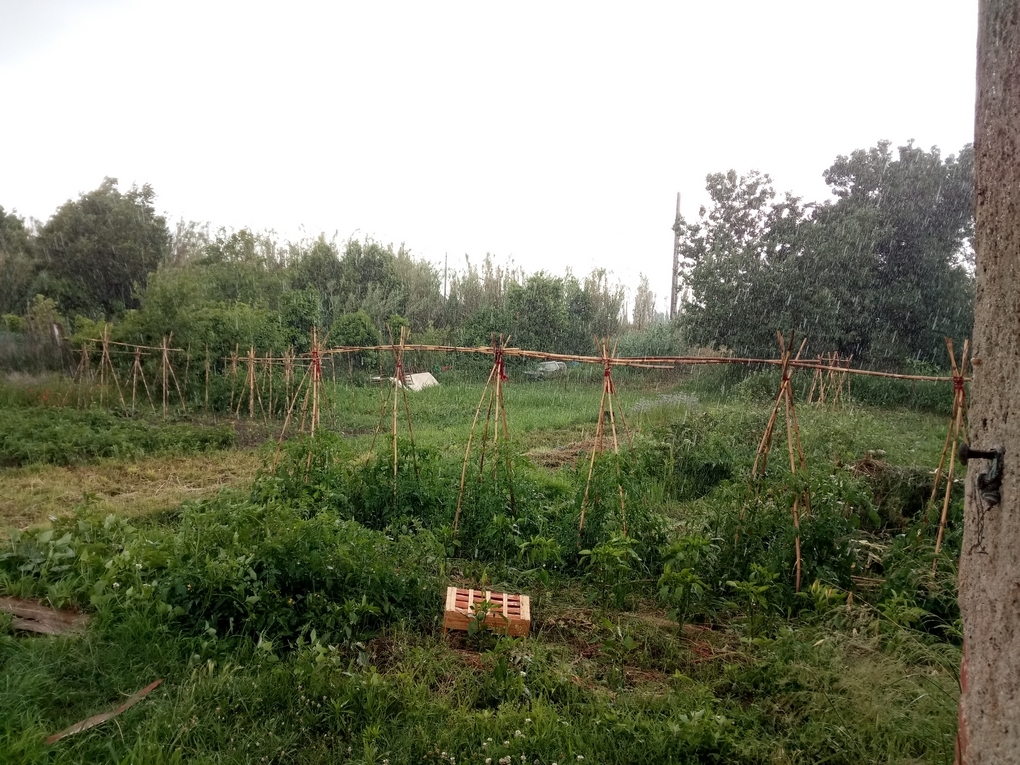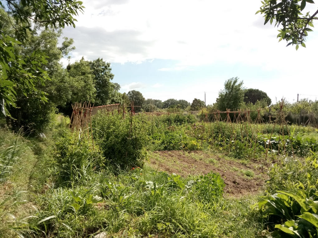 Vues du potager dans la partie Sud, riche et humide ! Là, il y a de tout, et l'objectif c'est que ça devienne une jungle tropicale d'ici quelques semaines ! Tomates, aubergines, poivrons, courgettes, courge musquée, gombo, piments, tout est mélangé !