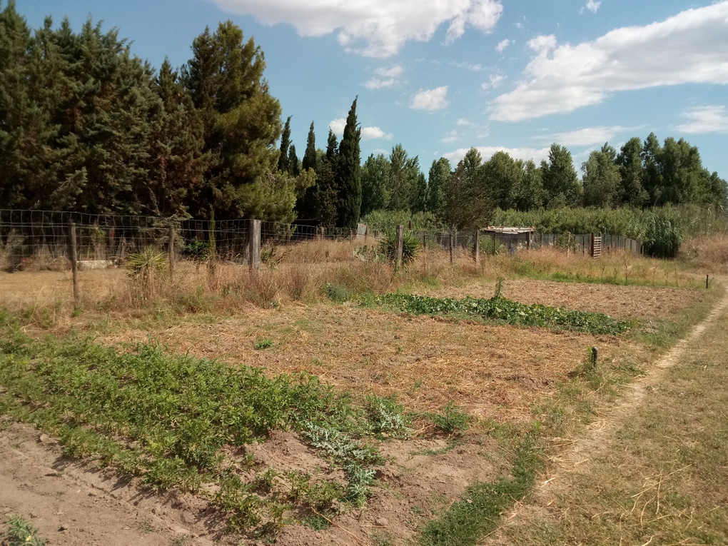 On peut voir une plantation de patates au premier plan. ça n'a pas marché, patates très petites, terre trop pauvre et sèche.