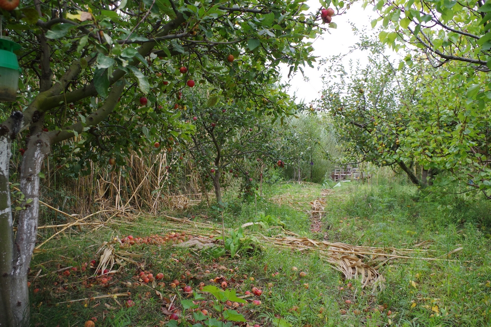 Petite mention aux arbres peints en blanc : c'est un traitement hivernal à base de chaux, pour tenter de calmer l'infestation de carpocapses de la pomme / abricots et noix.