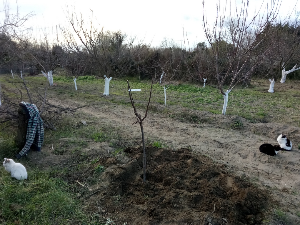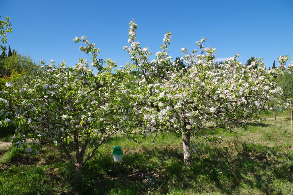 Petite mention aux arbres peints en blanc : c'est un traitement hivernal à base de chaux, pour tenter de calmer l'infestation de carpocapses de la pomme / abricots et noix.