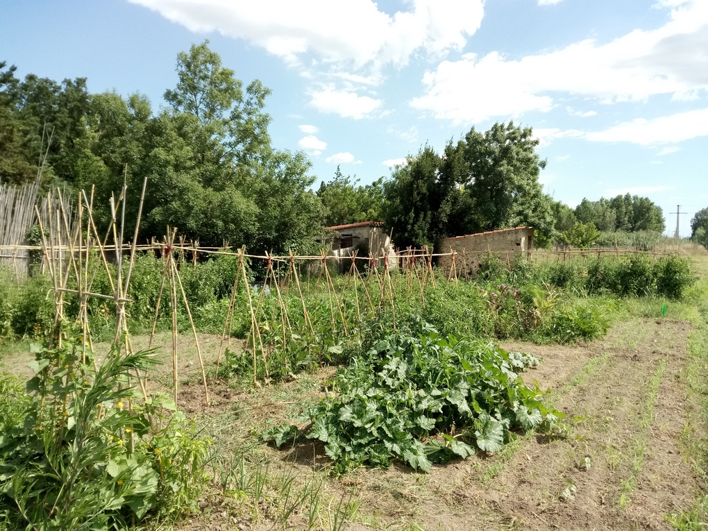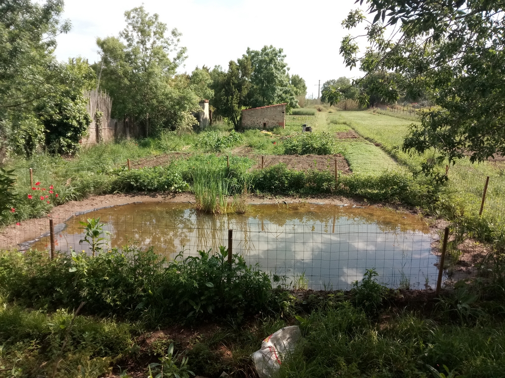 Pour le futur j'hésite à faire disparaitre le chemin carrossable au profit d'un simple chemin piétonnier. Vue de la mare. ça évolue, mais c'est encore assez lent. Premières plantations. Tomates, aubergines, patates, etc...