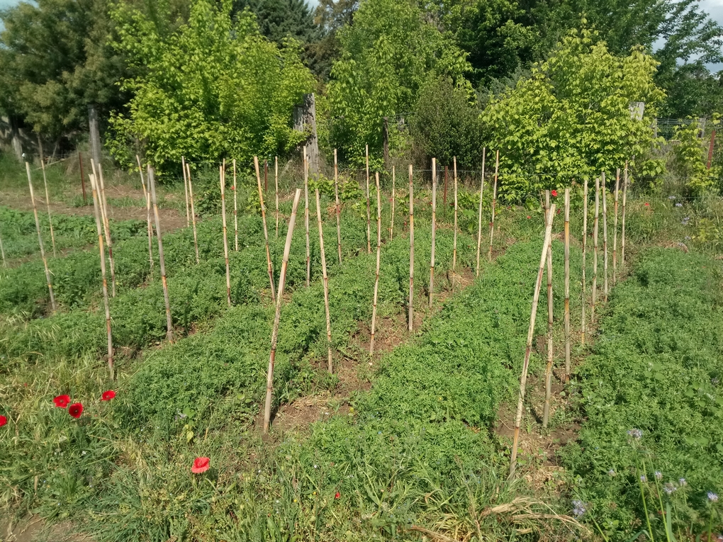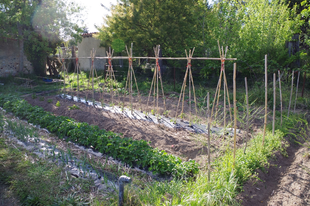 Au premier plan, les reliquats de cultures d'hiver. Sur la seconde photo, il y a un rang d'ail et des patates. Puis derrière, des tomates précoces. Cette année là, j'ai utilisé le plastique de paillage noir, afin de réduire les corvées de désherbage manuel. On ne le voit pas trop sur la photo, mais entre les rangs, j'ai installé une bonne épaisseur de mulch de broyat de canne de Provence.