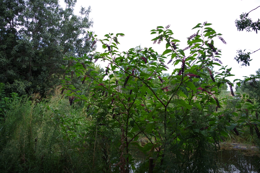 Vue de la mare, avec une immense solanacée exotique (plante invasive il me semble), mais que je trouve très belle, donc je l'ai laissée.