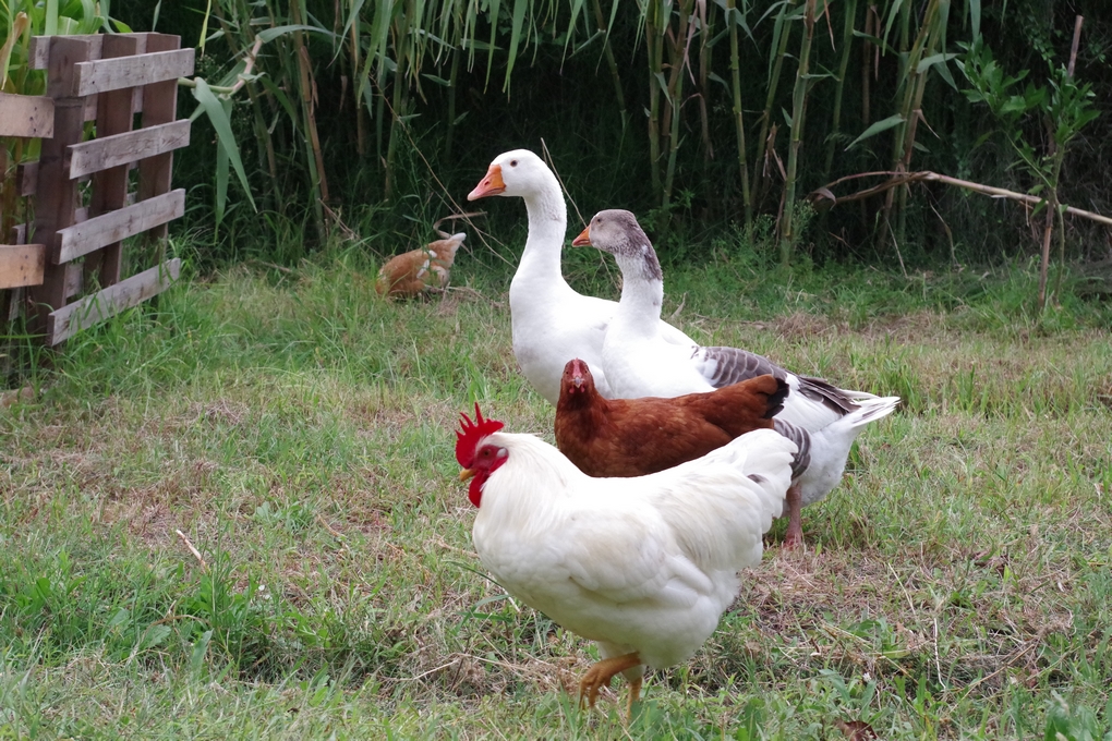 Voilà à quoi ressemblaient les pensionnaires, depuis leur acquisition au stade de poussins au printemps. Les voilà adultes et bien beaux ! Et heureux surtout !
