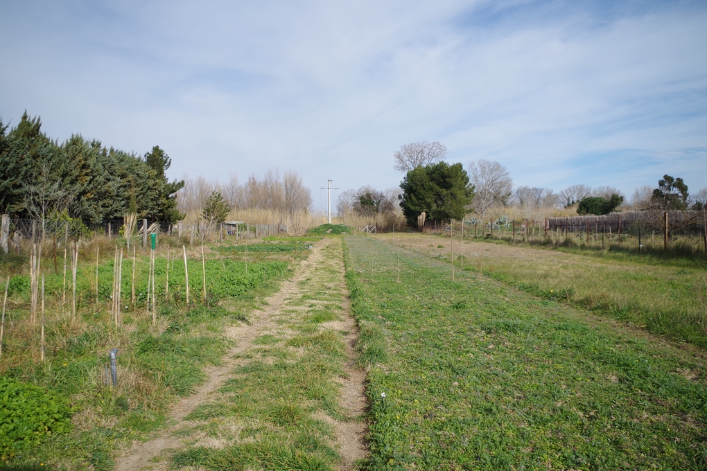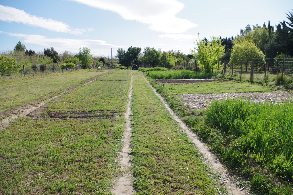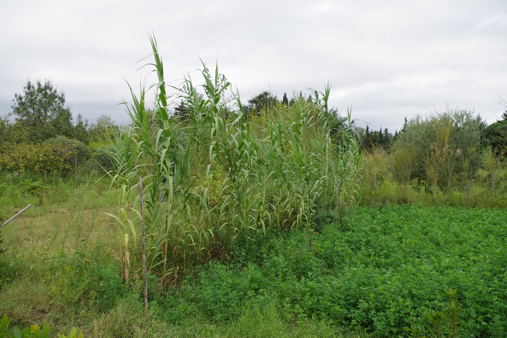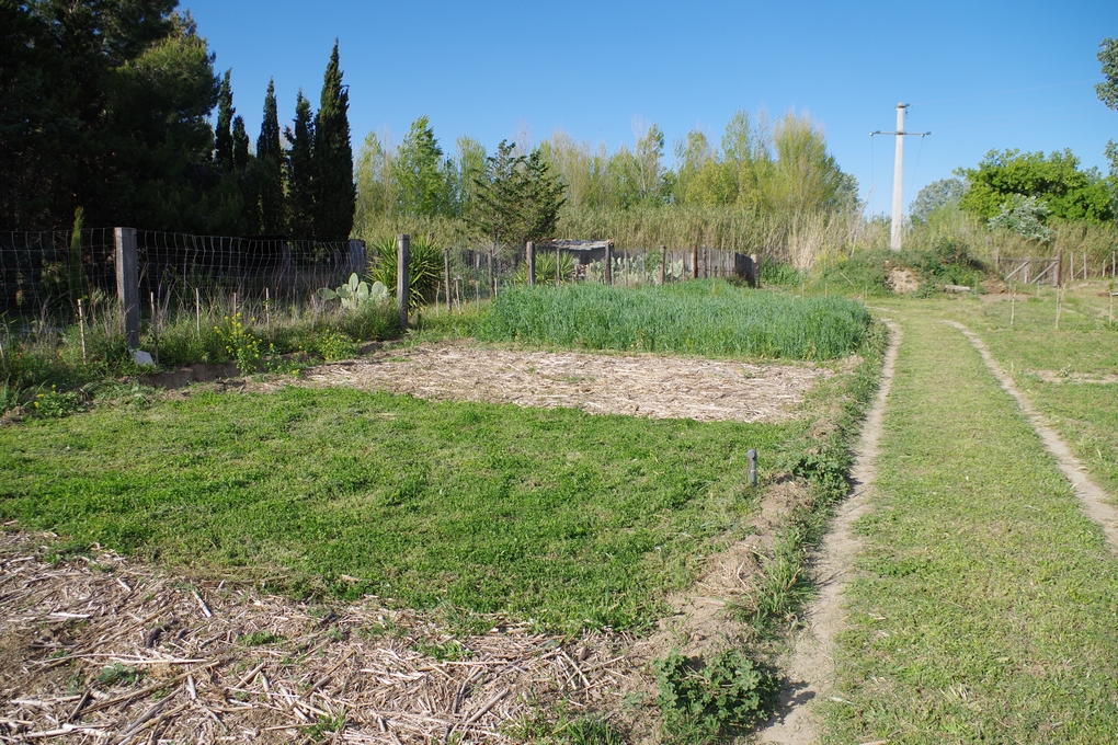 Succession de carrés de broyat de canne de Provence, trèfle incarnat, broyat de canne de Provence, seigle. Vue du carré de seigle. Juste avant, on le voit très peu, il y a une haie d'arbuste récemment plantée. Et juste derrière le carré de seigle, on devine une autre haie de petits saules. L'objectif de ces petites haies est triple :