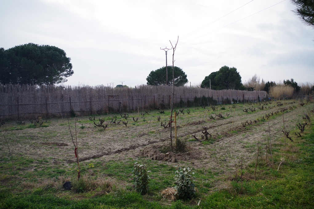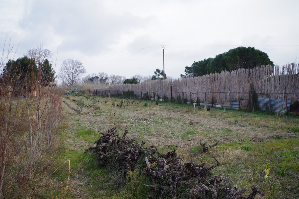 L'arbre récemment planté que l'on voit au centre de la photo, c'est un des 150 ou 200 arbres non fruitiers que j'ai planté un peu partout sur la parcelle. Là, c'est un peuplier blanc qui gênait le passage des voitures sur le chemin communal. Voilà une nouvelle vie pour lui ! On reste dans une logique d'agroforesterie. Sur la vigne, il y a pas mal de trous (manque de pieds de vigne). Pour y remédier, je ne vais pas replanter de nouveaux pieds de vigne, mais plutôt faire comme les anciens. C'est à dire, mélanger la vigne et les arbres. Sur la photo, chaque petit roseau correspond à un arbre fruitier ou non fruitier, soit directement semé, soit tout jeune transplanté. Sur cette dernière photo, on peut voir un morceau de la haie créée l'automne précédent avec des boutures de saule. Ces arbres ont une capacité à repousser incroyable ! On obtient vite une forêt.