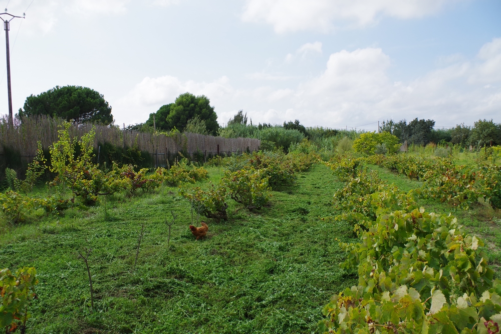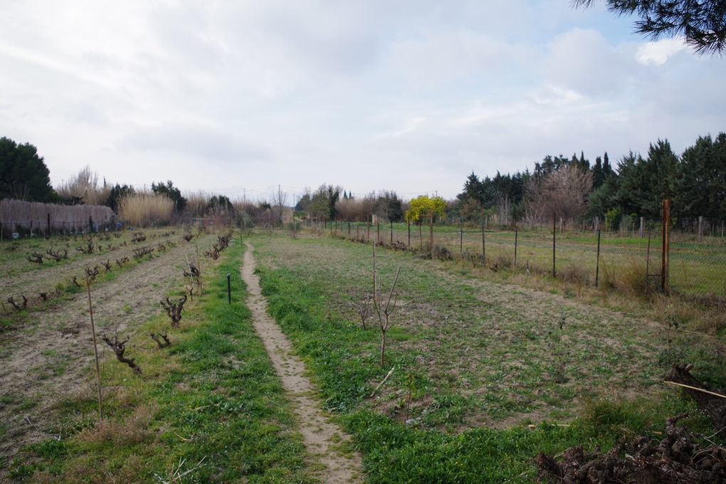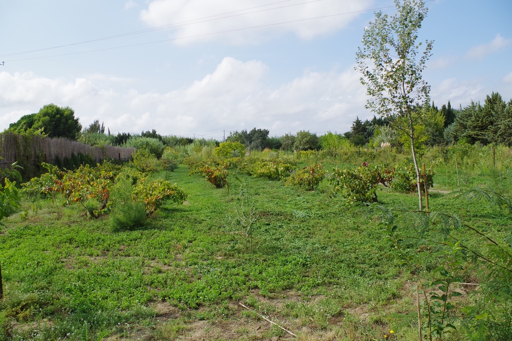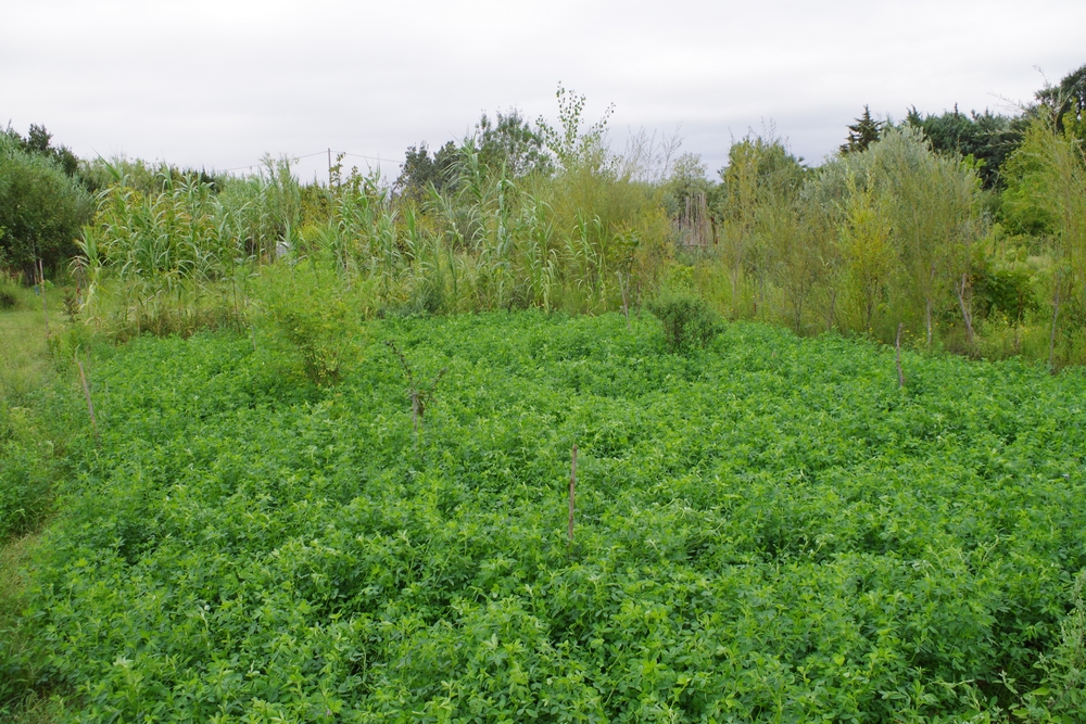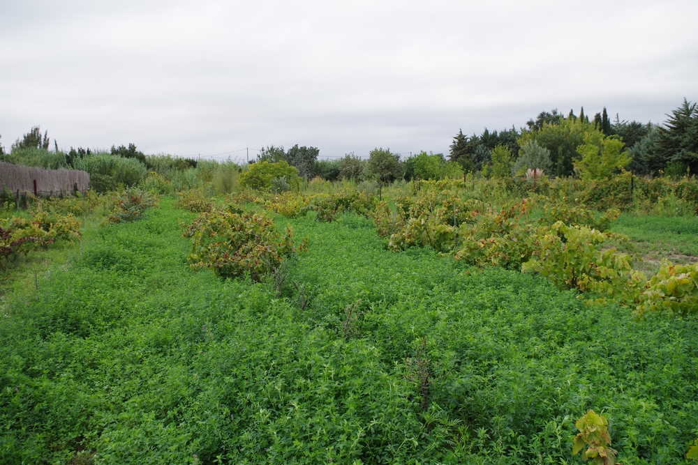 La vigne enherbée en luzerne Une zone de vigne arrachée et semée en luzerne, et plantée en même temps en jeunes arbres.