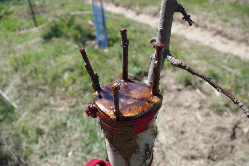 Quelques vues du verger Le jeune pommier regreffé en couronne. La nouvelle variété est la pomme banane. Des jujubes !