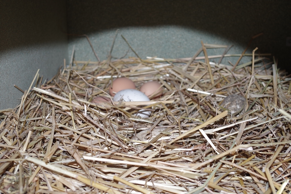 La nuit et les jours où je travaille, elles sont enfermées dans le poulailler. Dès que nous y sommes, c'est liberté totale. Une poule qui pond. Il y a plusieurs "pondoirs" dans le poulailler, mais toutes les poules, et même l'oie, vont généralement pondre dans la même caisse !!! Du coup, tous les matins, elles font la queue pour aller pondre