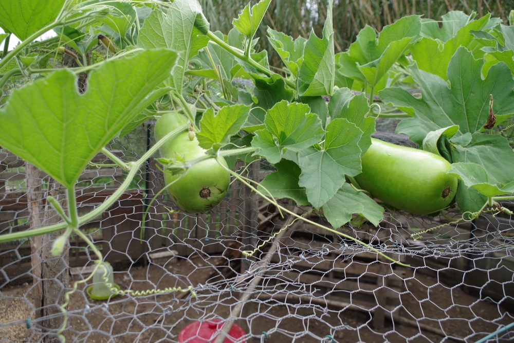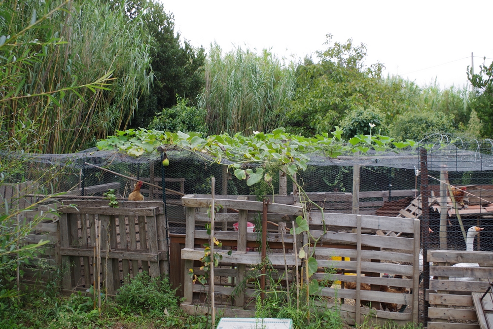 Quelques photos du poulailler. Cette année, j'ai semé des courges "slaoui" pour qu'elles grimpent sur le toit de l'enclos afin que ça fasse un ombrage frais.