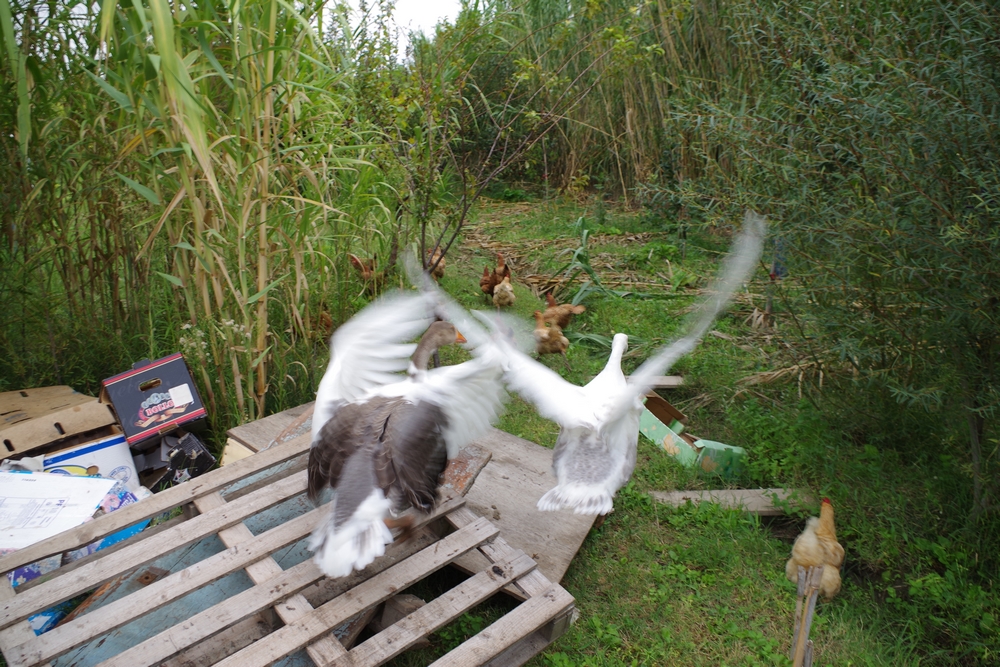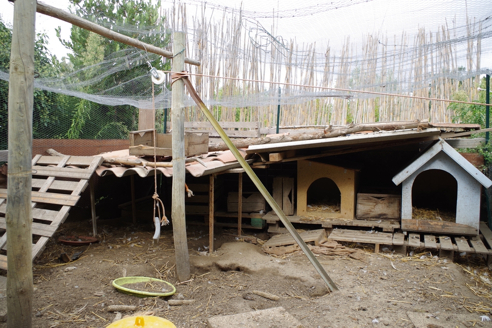 L'enclos grillagé avec sa muraille en palettes. LE matin, juste avant le lâcher des fauves ! Dès l'ouverture de la porte, c'est un véritable ouragan de folie ! Vu de l'intérieur. C'est très "récup", mais ça a l'air de leur convenir. Tout le monde dort dans une seule niche, y compris les oies !!! La niche de gauche est désertée. Et elles pondent toutes dans une seule cagette ! Vue des courges slaoui