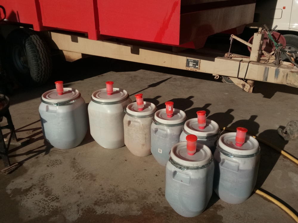 Ensuite, les futs de rouge (raisins noirs) sont fermés et équipés d'un barboteur pour la fermentation. Il faut que la peau des raisins reste dans le macérat pour obtenir un vin rouge. Sinon, on obtient un rosé.