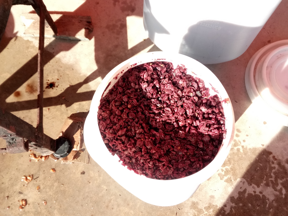 Au bout d'une dizaine de jours à température ambiante, la fermentation se calme. Je n'attend pas qu'elle soit terminée. Je vais ensuite presser le macérat de rouge.