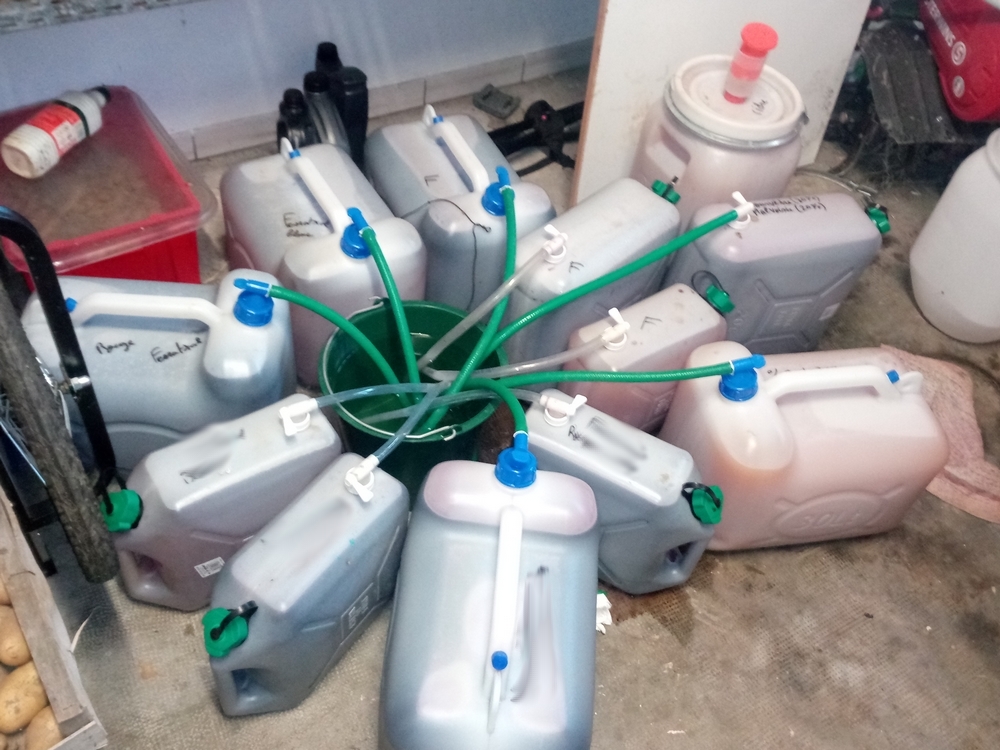 Puis, plus tard et plus lentement, un seconde fermentation (la fermentation malolactique) va se mettre en place et libérer un peu de CO2. La fermentation malolactique transforme la piquette en vin buvable. Habituellement, le laisse les bidons comme ça sans les toucher jusqu'au mois de mars ou avril de l'année suivante, c'est à dire au minimum 7 mois.