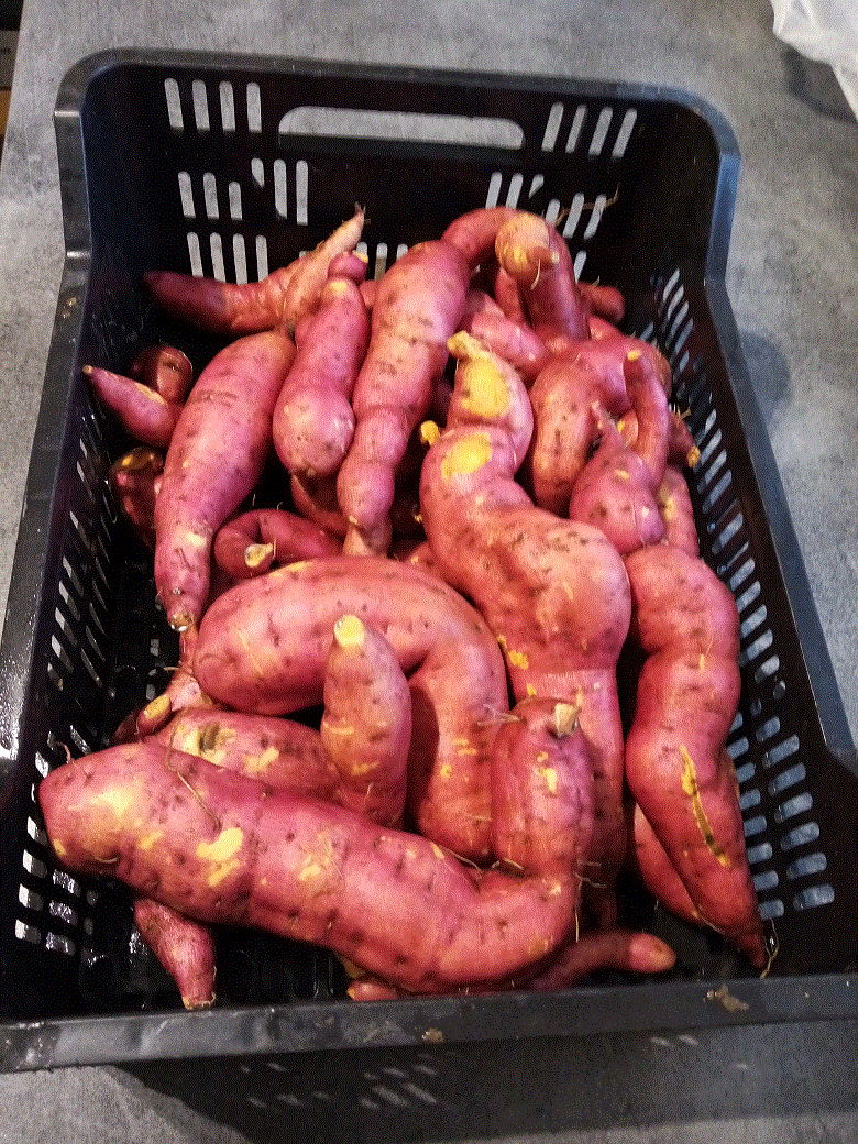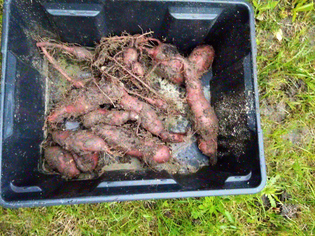 Les premières gelées étant annoncées cette semaine, j'ai sorti les patates douces dimanche matin sous la pluie, le premier pied était prometteur : 1,5 kg