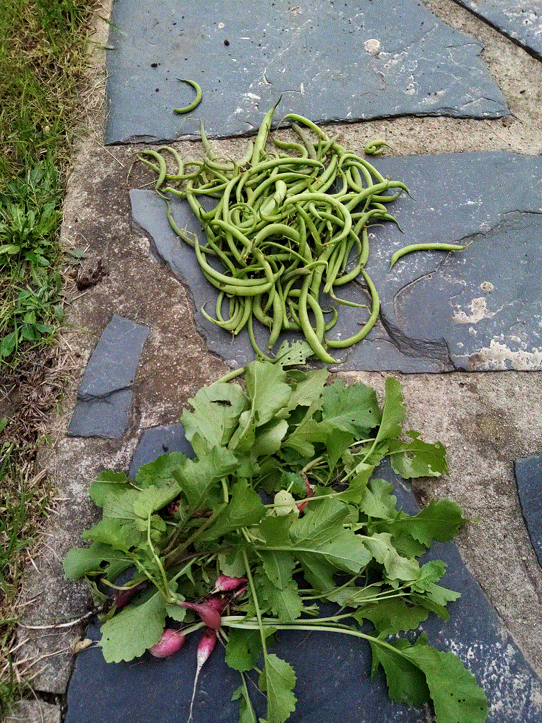 Hier, petite récolte de haricots, je suppose que le froid matinal devrait les stopper, dommage encore pas mal de fleurs.
