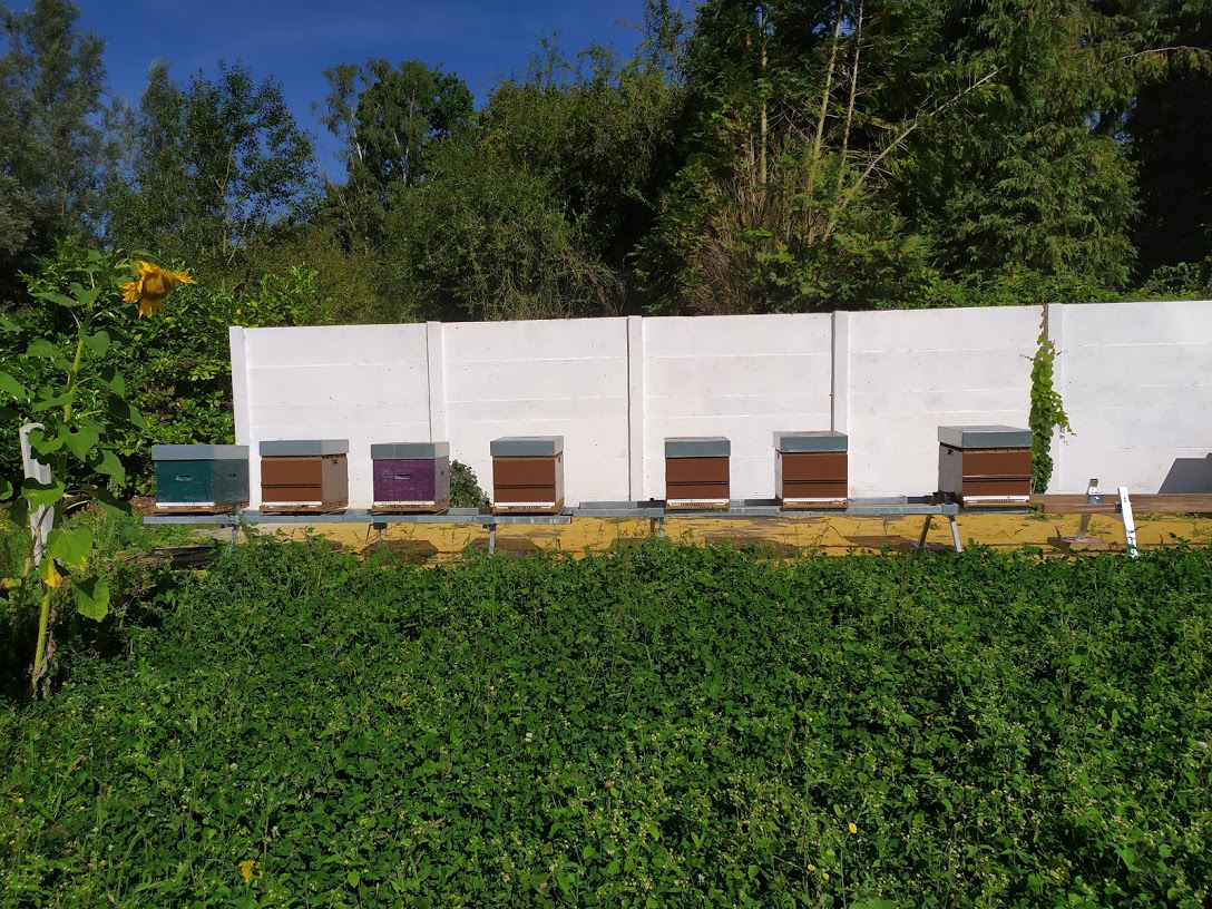 J'ai semé une parcelle de trèfle blanc en face de mes ruches, où poussent également des graminés divers.
