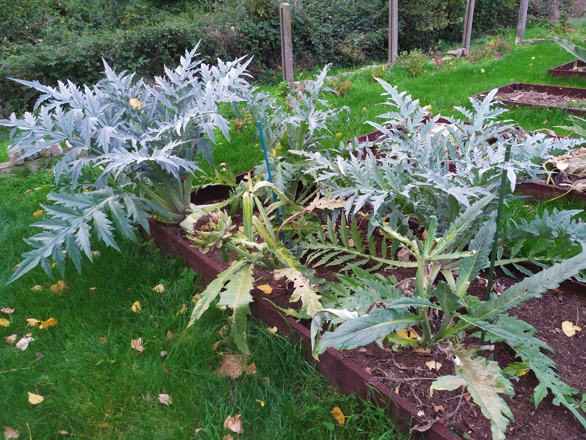 J'ai fait une planche d'artichauts en mai. Sans doute plantés un peu proches les uns des autres, mais ils ont produits comme des fous, et se sont portés comme un charme... sauf deux, qui montrent depuis trois semaines des signes de maladie.