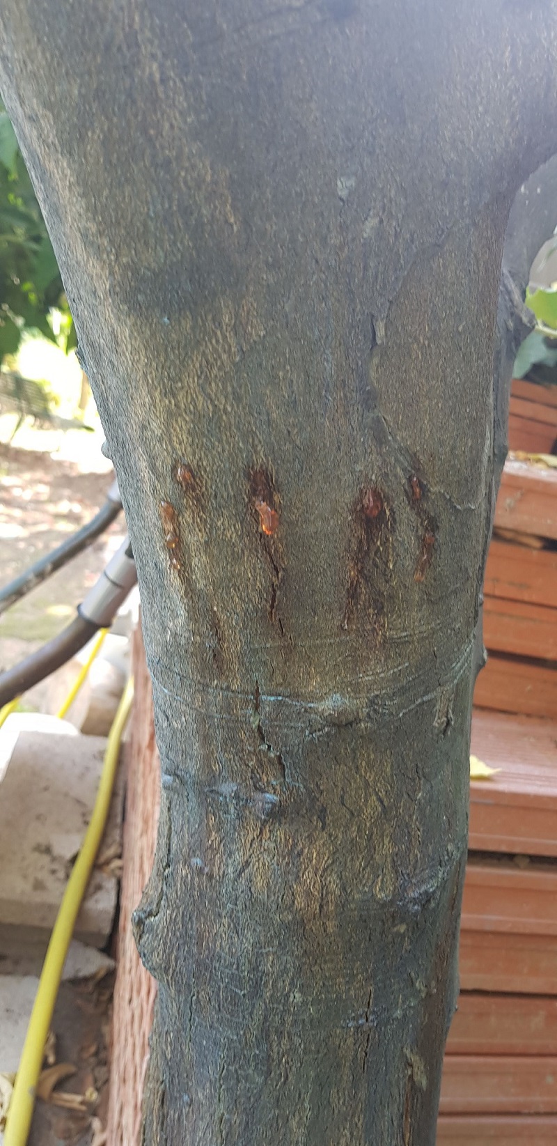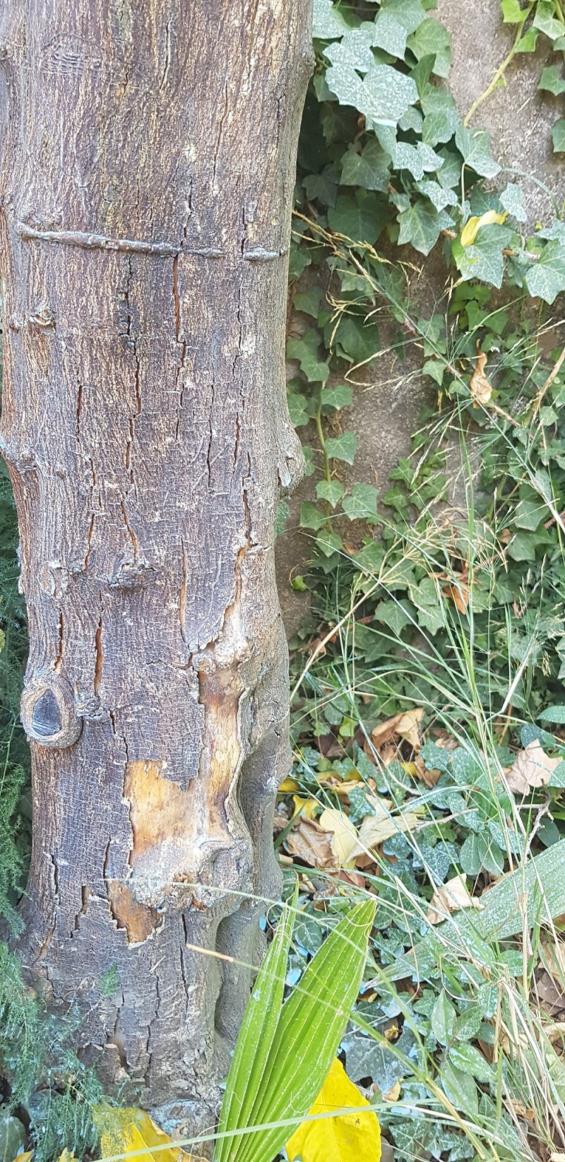 L'écorce se fend sur le tronc et des goûte de sève brune comme de l'ambre sort a un endroit du tronc....